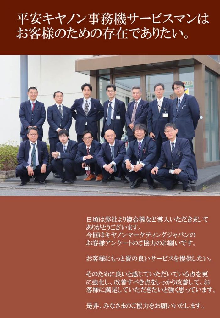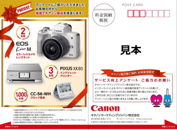 2019年4月23日 / 最終更新日時 : 2019年4月23日 WP管理者 お知らせ お客様満足度調査アンケートが始まっています。 毎年キヤノンマーケティングジャパンが行っている、お客様満足度調査が今月から始まっています。はがきが届きましたら、ぜひ皆様のお声をお聞かせください。 アンケートはがき アンケートチラシ