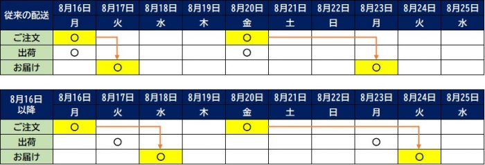 当日出荷と比較し、下記例のように今後はご注文から
