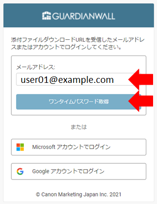 2.ブラウザにダウンロードサイトの画面が表示されますので、受信したメールアドレスを入力し、「ワンタイムパスワード取得」をクリックします。